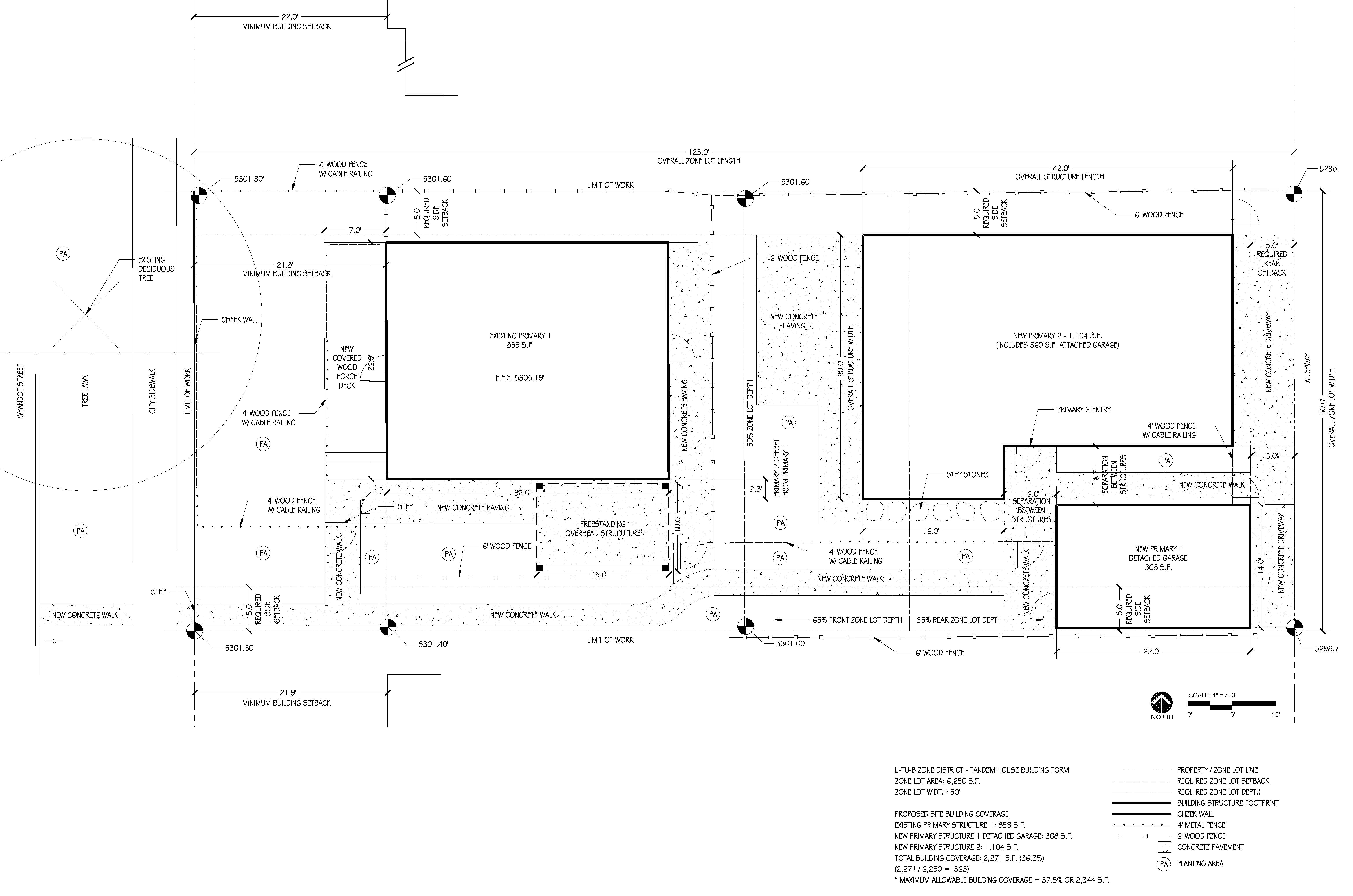 Other zoning parameters to point out is the structure length of New Primary 2 that we maxed out at 42 feet long. Structure width is allowed at 32 feet that we limited to 30 feet because we maximized the 37.5% allowable building coverage of the site. Because the Primary 1 garage is detached, the 5-foot side setback does not apply and therefore we are able to push the structure out towards the property lot line. The configuration creates space between Primary 2 and Primary 1 detached garage to form a secondary entry from the back alleyway. Private landscape space is programmed at the front and south side of Primary 1 and Primary 2 landscape space is between the two primary structures.