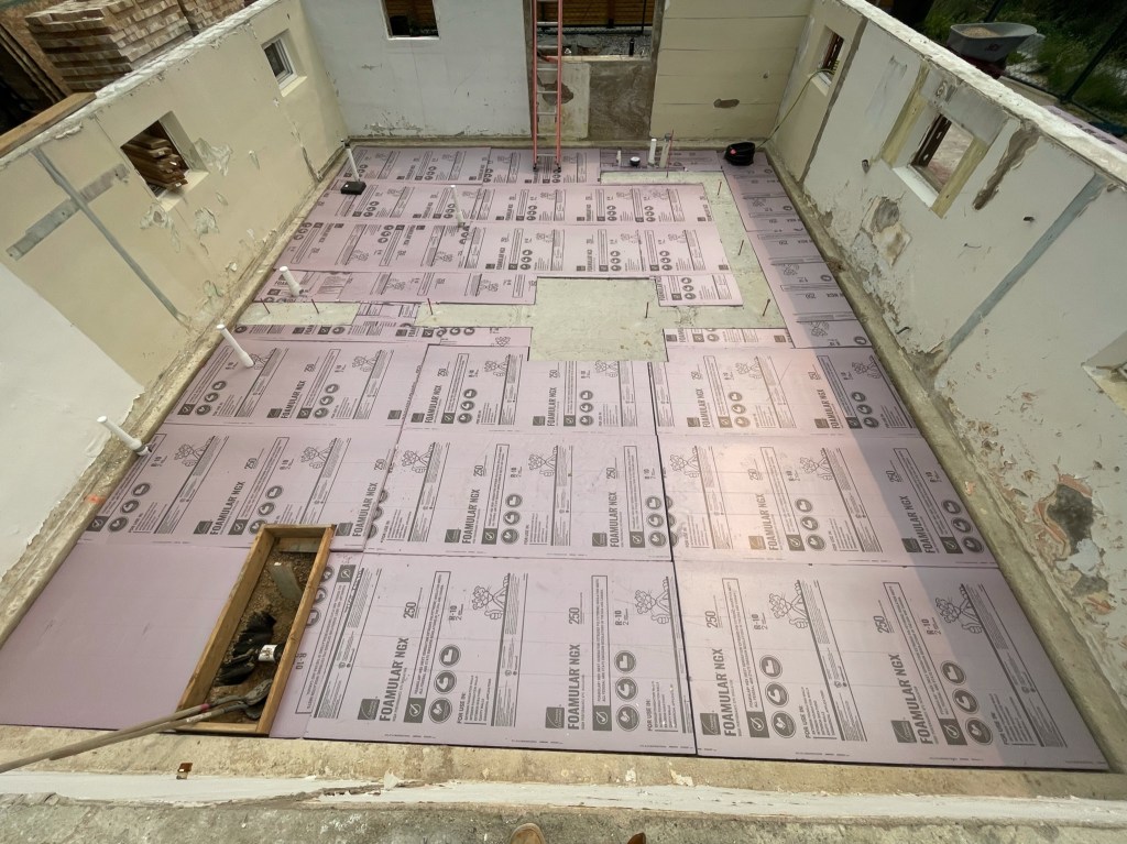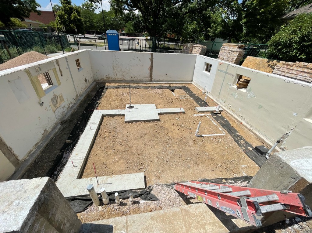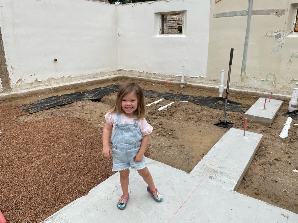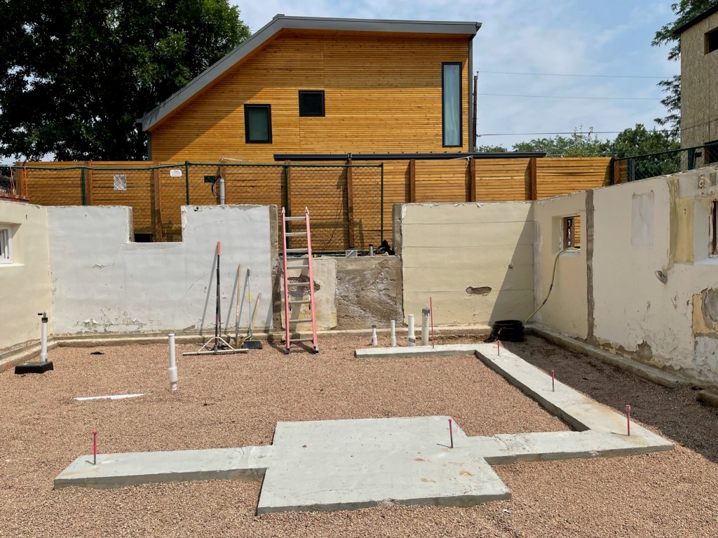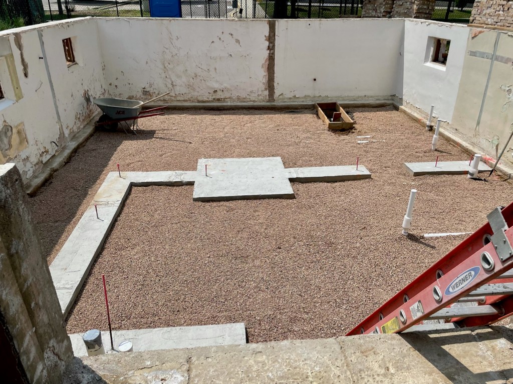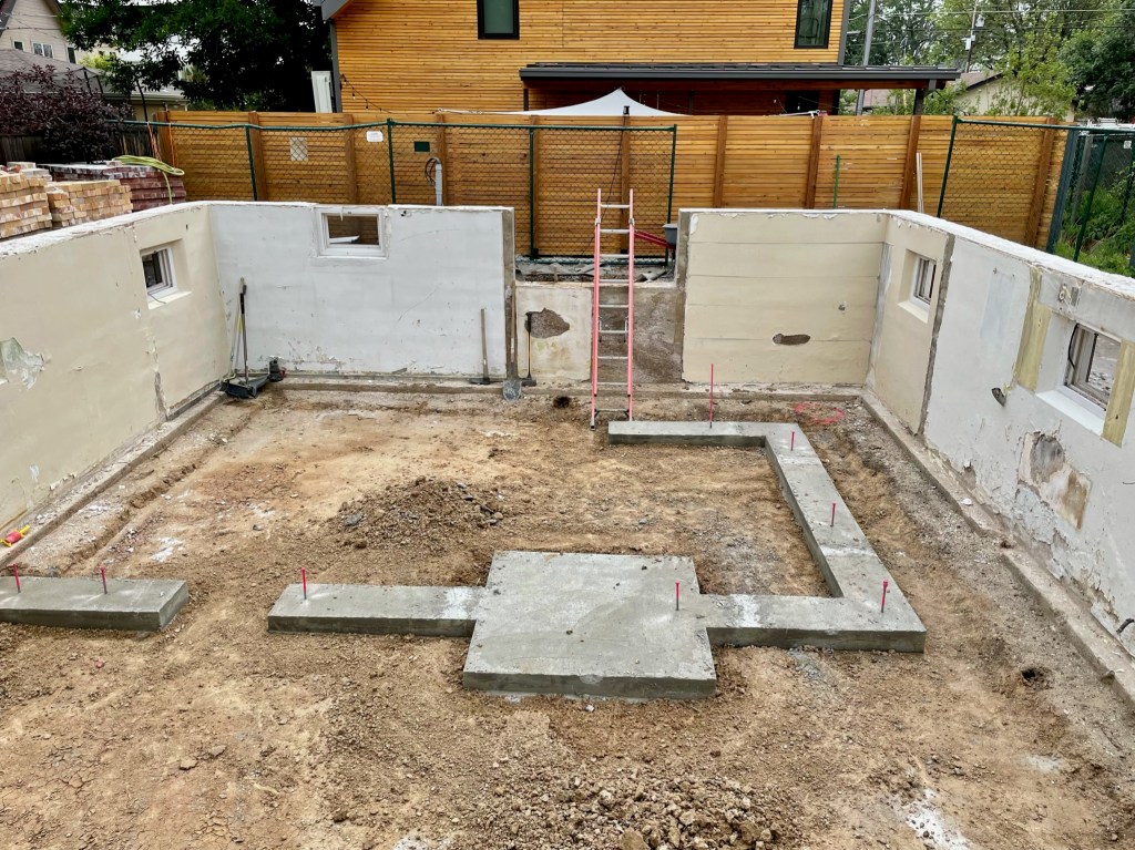At times it feels like things are going slow but we are moving forward putting all the unglamorous pieces together that make for a thoughtfully built home. Because we demoed the original slab-on-grade (SOG) we are able to add proper drainage, plumbing, and insulation beneath the basement floor. The time-lapse below shows our first forward progress. Foundation footers were formed and poured which will support structural walls. The perimeter underdrain consists of a perforated pipe that drains to the sump pump to prevent any future basement flooding. Then underground plumbing, insulation, and vapor barrier went in just before the new concrete SOG was poured.
