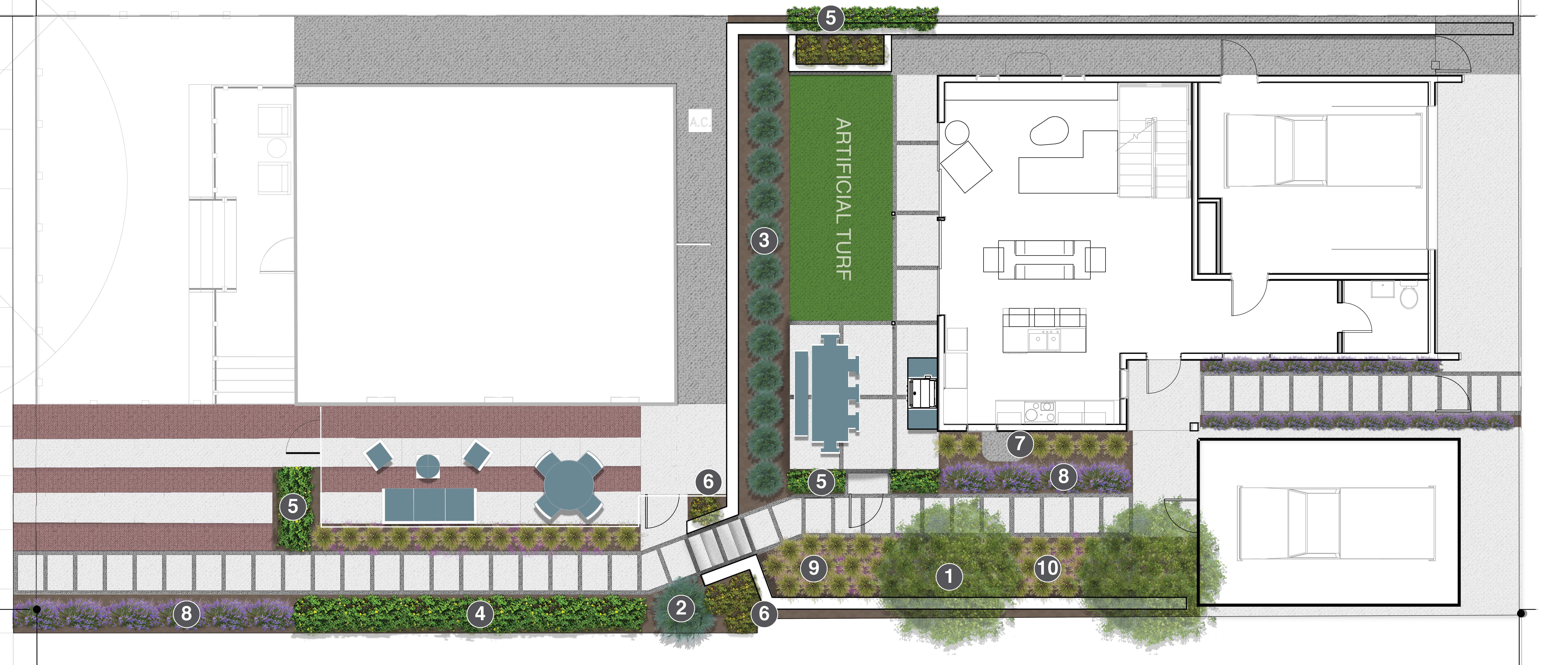 Tandem House was conceived to be a sustainable home that is achieved in every respect from using SIP panels, solar panels, and an efficient HVAC system (among numerous other things). The house will be LEED-certified (we should have the certificate any day now) and the landscape is a major component to receiving the necessary points required for the certificate.