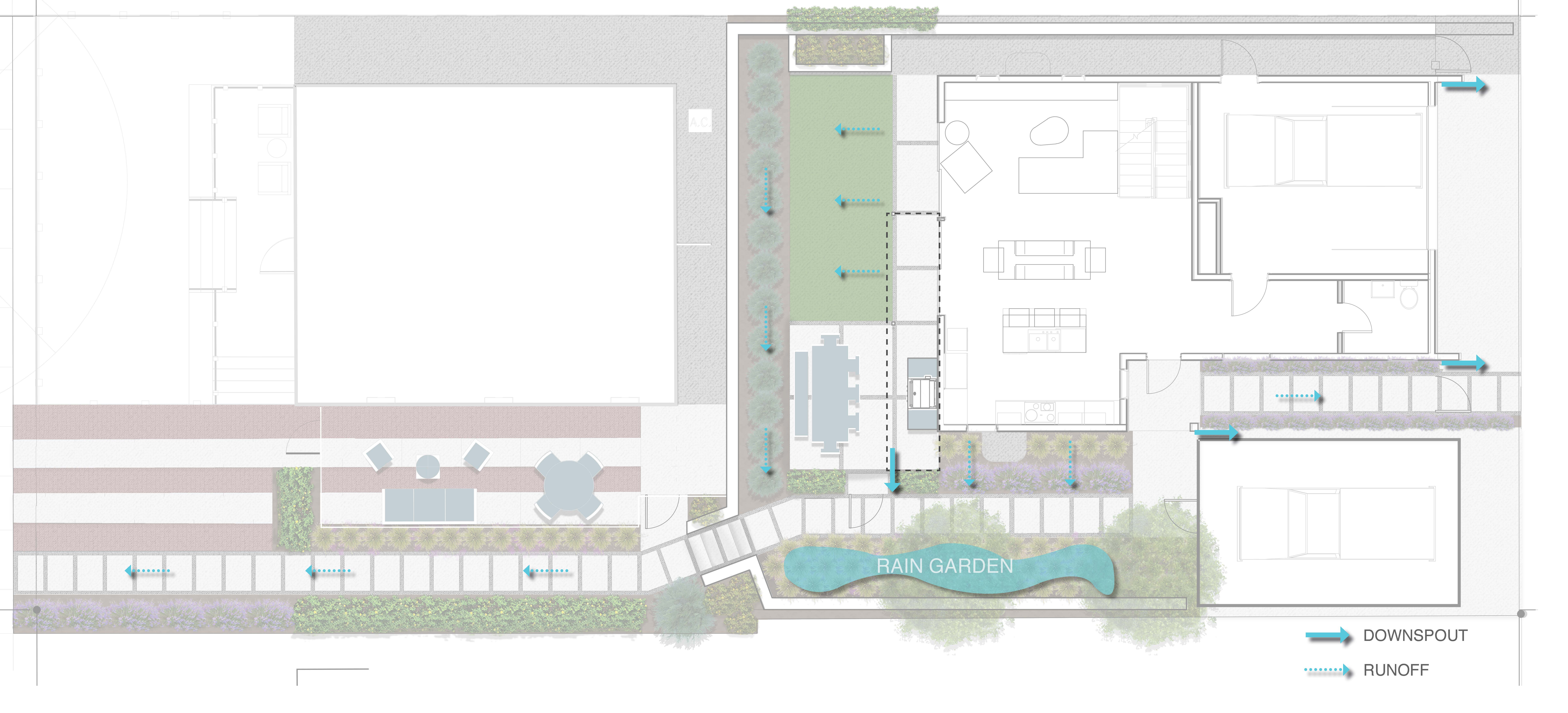 The grading and flow of water on-site is a big factor in plant selection, ensuring that plants that require less water are at a higher grade and those that thrive off more water are at low points. The water diagram below shows the flow of water on-site and from the roof downspouts. The water that is handled on-site, flows to the native grass rain garden that can handle large water events with droughts in between. The landscape acts as a sponge, soaking and cleaning water as it flows through the site and into the groundwater system.
